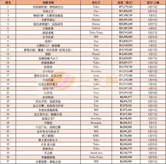 统计周期内,票房排在前6位的作品日本本土票房收入均超过14亿日元,除《妖怪手表:鬼王的复活》在2017年上映,其他5部均在今年3、4月份上映。