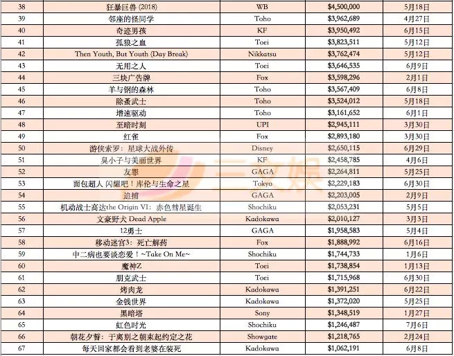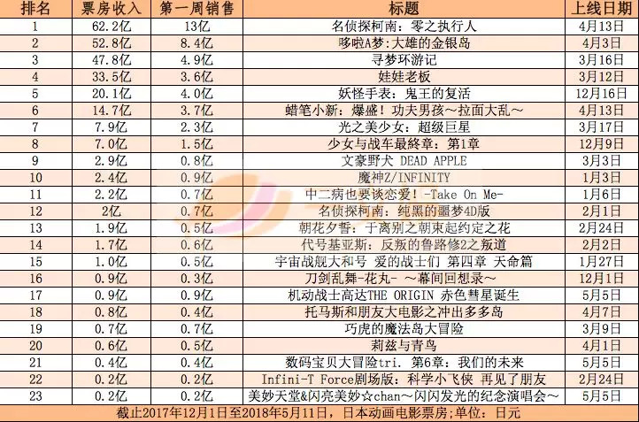 5月中旬之后到六月底,在日本市场新上映的动画电影并不多,而去年12月又是一个圣诞黄金档期,我们再把统计的上映时间放在2017年12月1日至2018年5月11日。