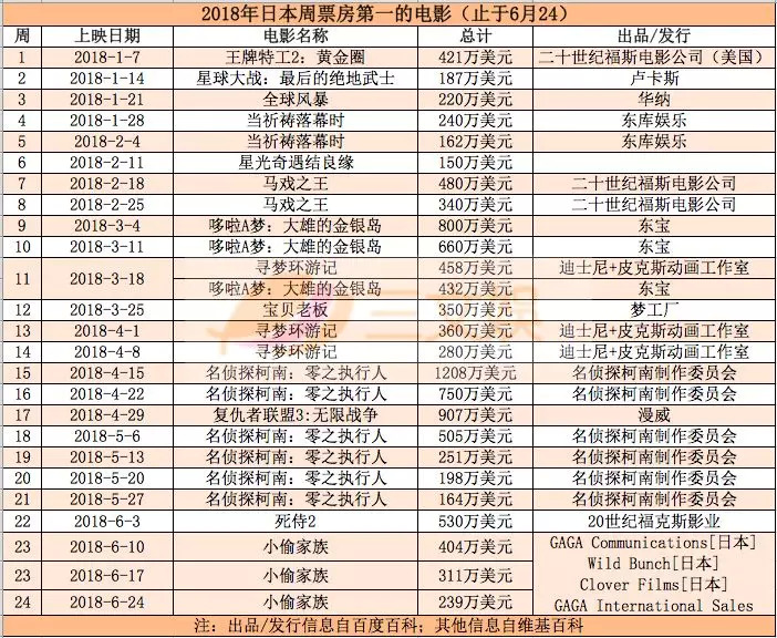 上半年的日本电影市场,老IP新作《哆啦A梦:大雄的金银岛》《名侦探柯南:零之执行人》等多次登顶周票房榜,柯南剧场版甚至还战胜了《复仇者联盟3》,显示出了动画在二次元之国日本的威力。