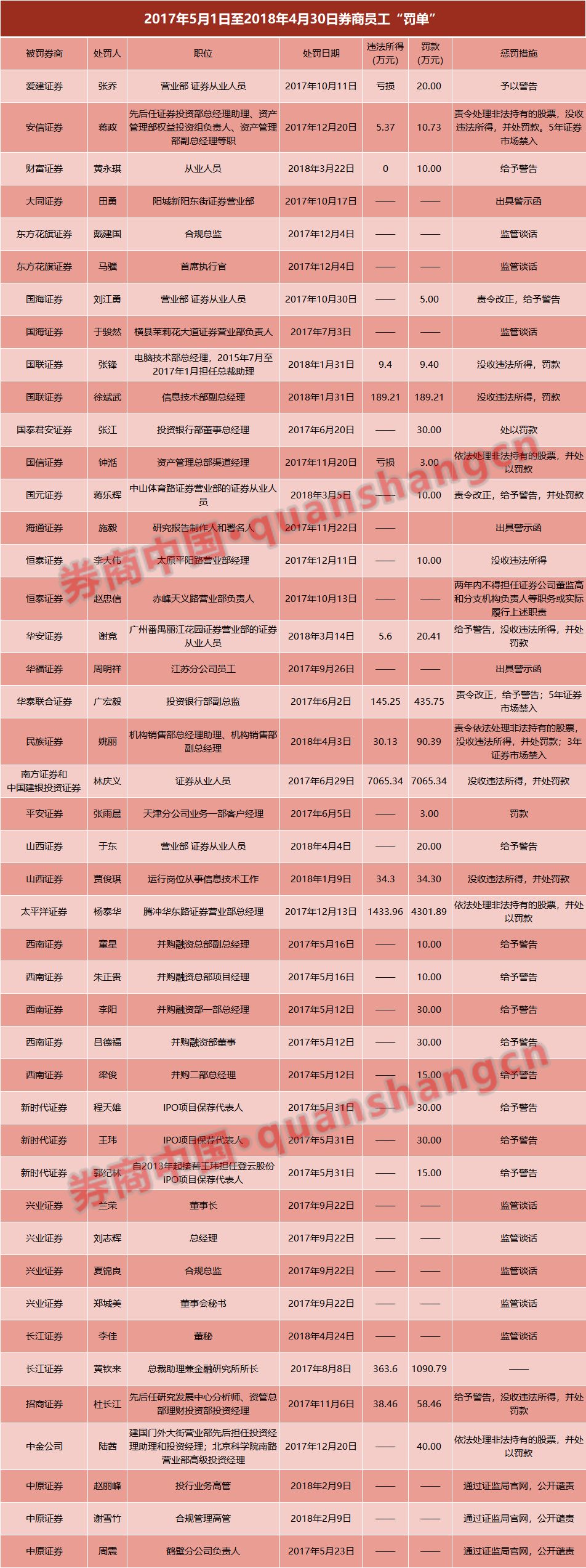 券商中国记者统计,证监会及其派出机构在2017年5月1日至2018年4月30日期间,累计发布了55张“罚单”,被点名处罚的证券公司达41家,内控合规问题是各家券商被处罚的重灾区。