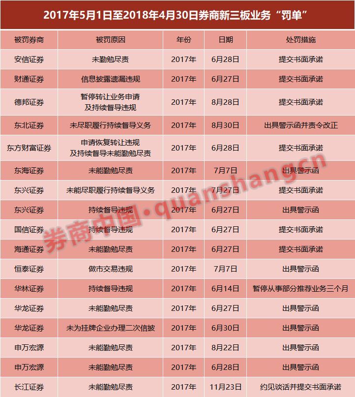 而今年股转系统给券商开出的罚单数量则大幅减少。券商中国记者统计,从2017年5月1日至2018年4月30日,股转系统一共给券商开了17张罚单,涉及14家券商。