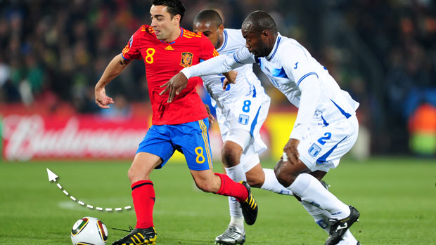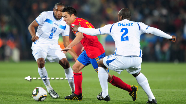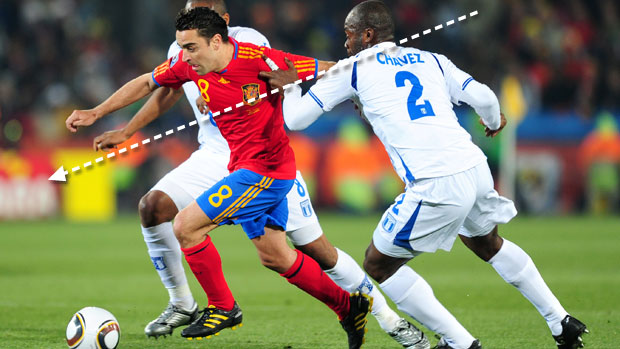 从下图可以看到哈维第一脚触球的时候就摆脱了防守队员,他是通过触球变向做到的。很多人认为第一脚触球的关键是如何舒服的把球控制在自己脚下,而我认为更重要的是出球的方向,图中,哈维的身体摆动和触球变向已经把球带到了一个对手碰不到的区域里。