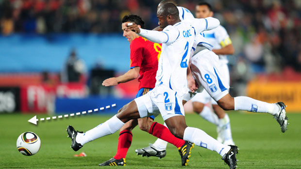 这一步,最关键的就是保护皮球。图中,在这一环节,他使用胳膊撑开空间护住皮球,当两名防守队员碰不到球。他这样并不犯规,而且还能挤开空间,完成加速。这一步叫做短距加速能力,能够与盯防你的球员扯开五码的距离。这不见得是多牛的事情,不过配合第一脚触球变向,这能够让你在拥挤的中场扯出空当。