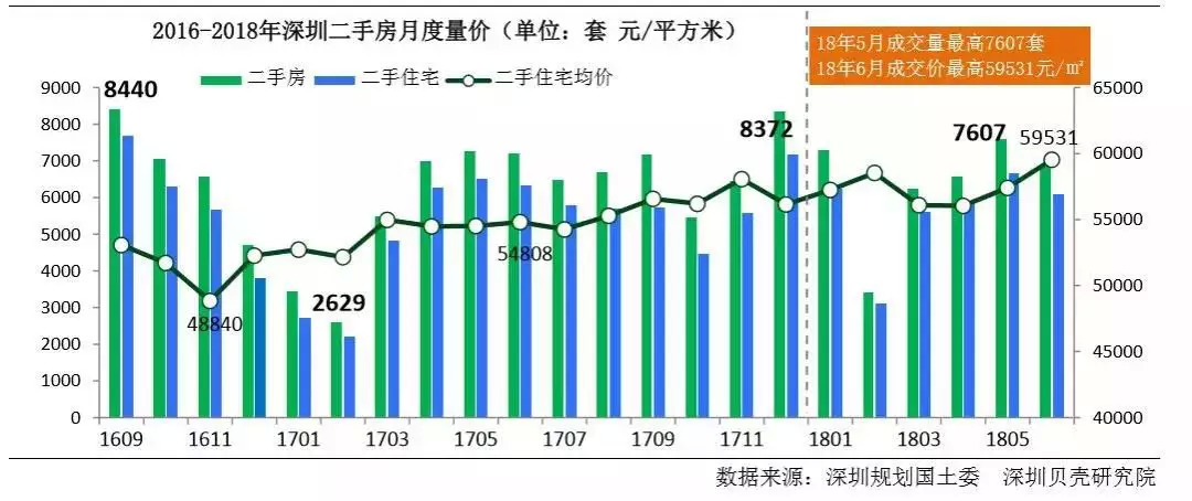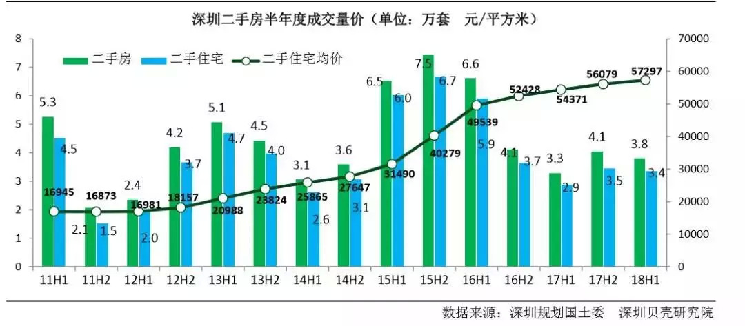 根据深圳贝壳成交系统数据统计,2018 年上半年二手住宅成交均价为57297元/平方米,环比上涨 2.2%,同比上涨 5.4%。成交量方面,上半年则相对比较稳定。