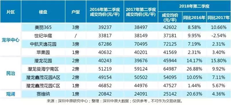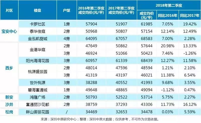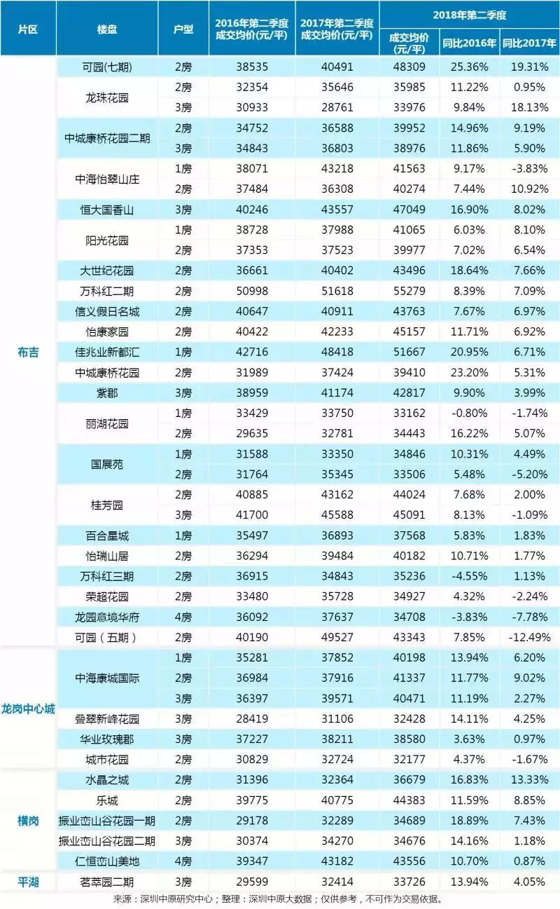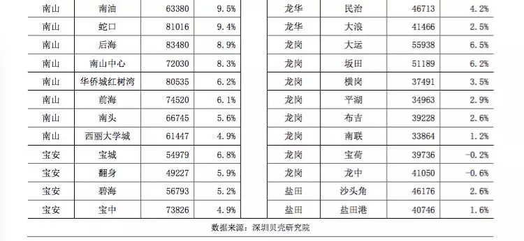 看完总体情况,再看看具体片区的涨跌情况。贝壳研究院统计了深圳60个热点片区数据,只有三个片区成交价格微跌,而且跌幅都很小,最高的罗湖布心片区,跌幅也只有0.7%,龙岗龙中和宝荷片区,则分别跌了0.6%和0.2%。