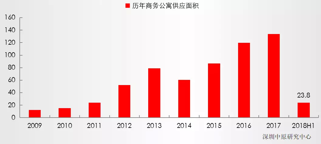 2018年上半年,商务公寓批售项目11个,总供应面积23.8万平 ,同比下跌49.1%。上半年供应量为去年供应量的17.8%,供应面积大幅度下滑。
