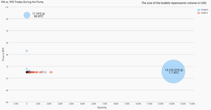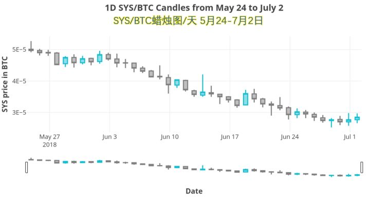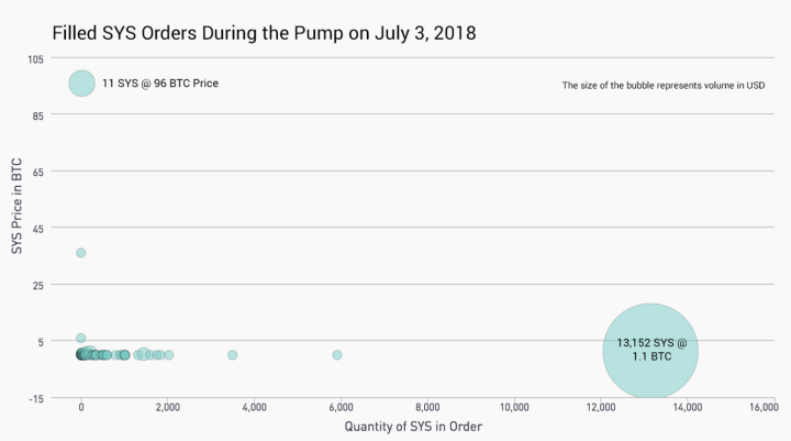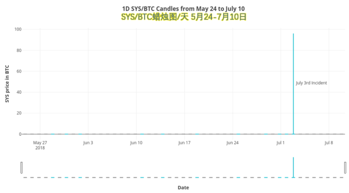 在 7 月 3 日之前 SYS 的价格并没有什么特别之处,然而 7 月 3 日当天价格却十分可疑地飙升至 96 比特币。