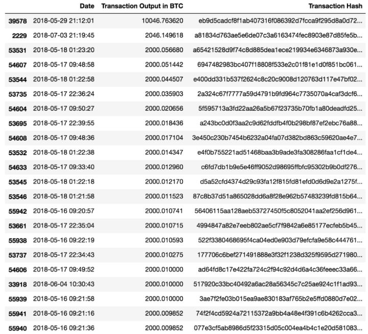 我使用 Blockexplorer API 提取了从 4 月 30 日到 7 月 6 日交易输出列表,并以输出量进行降序排序。