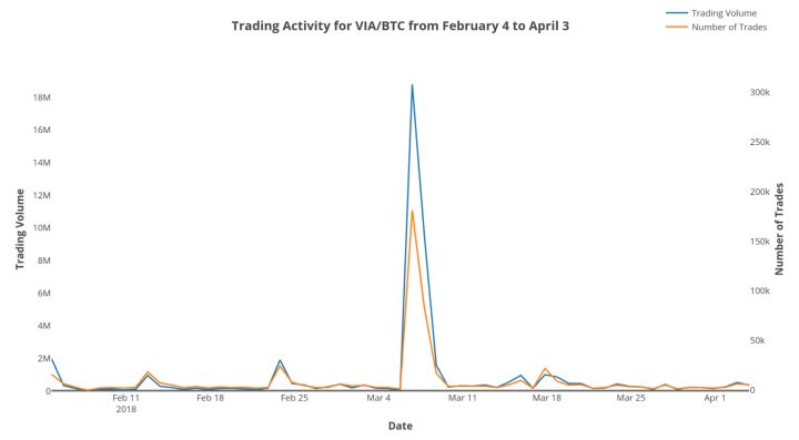 虽然 VIA 的交易活动图和烛台图看上去与 SYS 十分相似,但他们的历史成交数据却大相径庭。