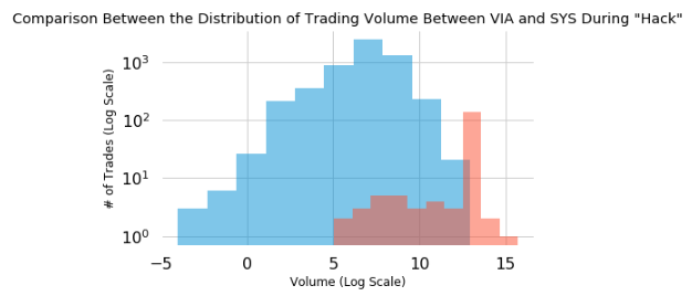 如果我们把所有的 SYS 交易拆分成单笔交易,并比较它和 VIA 的交易量分布,就会发现很明显 SYS 的交易量要大得多。