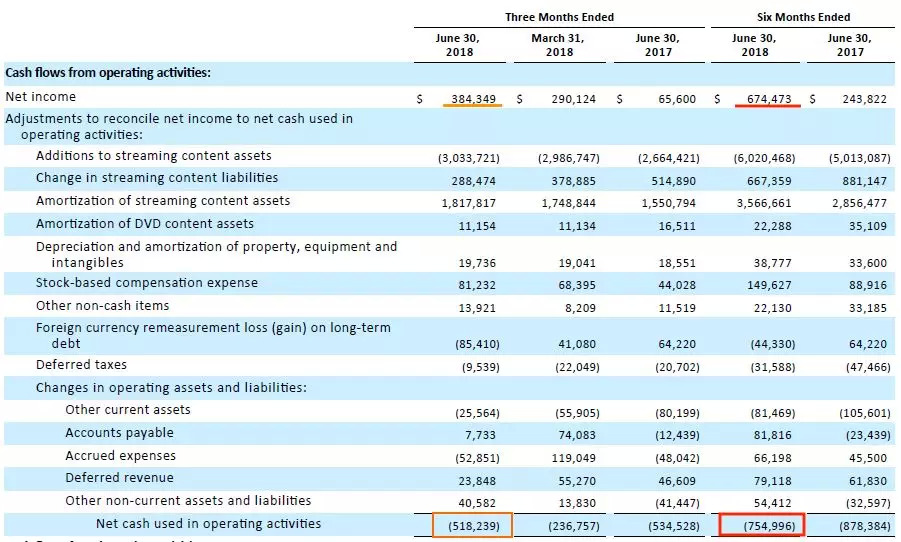 财报数据显示,Netflix正通过大量举债进行扩张,公司在2018第二季度完成了一单公开市场发债,募集资金19亿美金,导致上半年末长期负债高达83.42亿美金。
