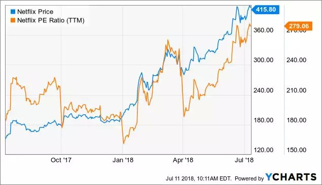 Netflix市盈率(橘黄色曲线)与股价(蓝色曲线)