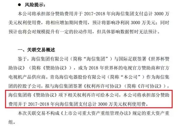 二级世界杯官方赞助的金额虽据公开消息称为6800万美元~1亿美元之间。不过,作为此次世界杯官方赞助的蒙牛相关负责人在采访时提到,5000万美元拿下世界杯赞助席位;而海信集团也在与子公司的关联公告中,披露了子公司营销所支付的部分赞助费为3000万美元。而三级区域赞助费,据拿下亚洲区域代理权的当代明诚(600136)公告信息,约为2000万美元左右。