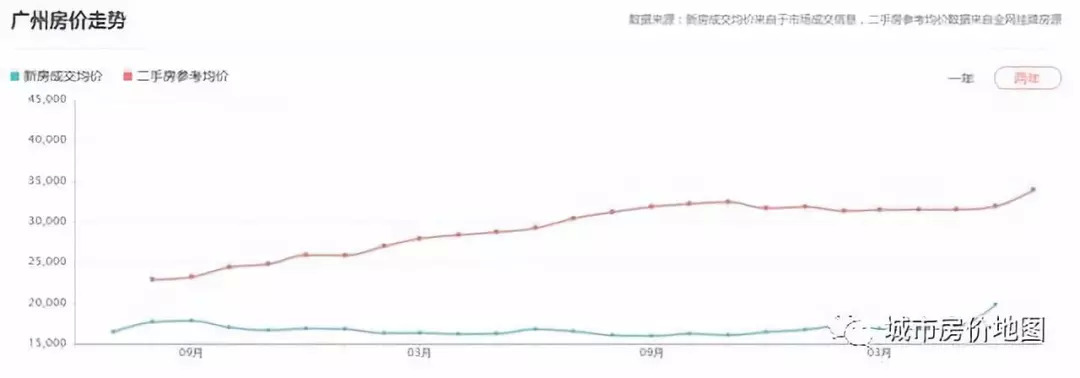 来自房天下查房价网的数据显示,7月广州二手房挂牌均价为33981元/㎡,环比上涨6.25%,同比上涨11.49%。从上述广州近2年房价走势图可以看出,至2017年11月,广州二手房挂牌价一直保持快速上涨的势头,12月开始涨幅得到显著遏制。