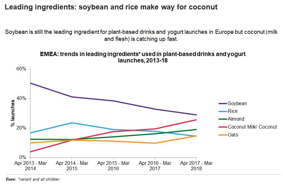 燕麦奶在欧美市场爆红,尤其是在餐饮、早餐等消费场景中,继而掀起了全球燕麦奶潮流。据Mintel 数据显示,欧洲市场上,植物基产品中椰奶和燕麦奶增长较快;从上市新品来看,2017年4月到2018年3月,以燕麦为主的植物基饮品和酸奶占比为14.8%,去年同期仅为9.8%;燕麦、椰子、扁桃仁成为三大明星增长配料。