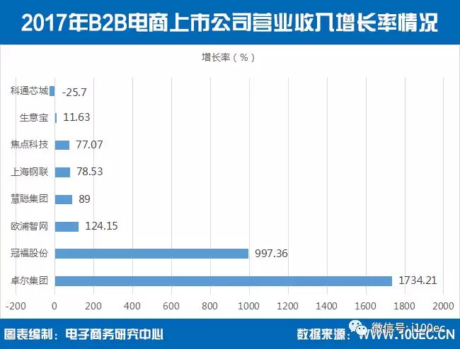 据电子商务研究中心(100EC.CN)监测数据显示,2017年B2B电商上市公司营业收入增长率排名情况为:卓尔集团1734.21%、冠福股份997.36%、欧浦智网124.15%、慧聪集团89%、上海钢联78.53%、焦点科技77.07%、生意宝11.63%、科通芯城-25.70%。