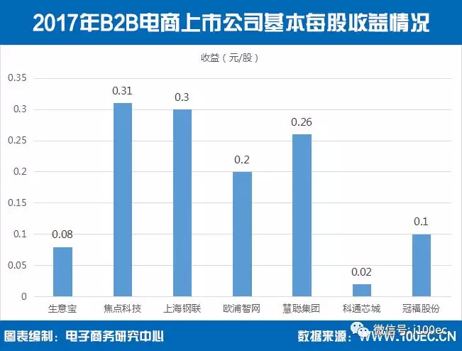 据电子商务研究中心监测数据显示,2017年B2B电商上市公司基本每股收益情况分别为:焦点科技0.31元/股、上海钢联0.30元/股、慧聪集团0.26元/股、欧浦智网0.2元/股、冠福股份0.1元/股、生意宝0.08元/股、科通芯城0.02元/股。