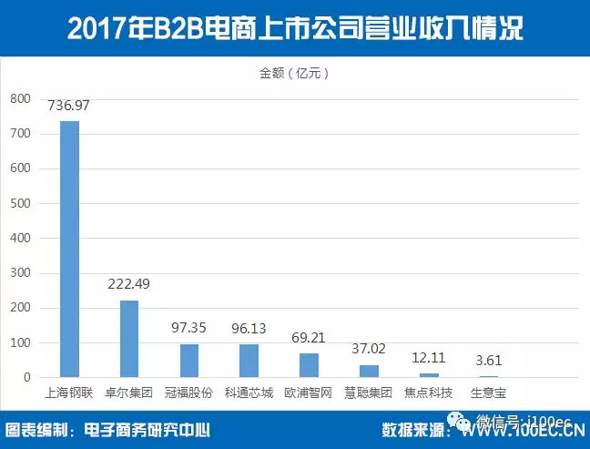 据电子商务研究中心监测数据显示,2017年B2B电商上市公司营业收入排名分别为:上海钢联736.97亿元、卓尔集团222.49亿元、冠福股份97.35亿元、科通芯城96.13亿元、欧浦智网69.21亿元、慧聪集团37.02亿元、焦点科技12.11亿元、生意宝3.61亿元。