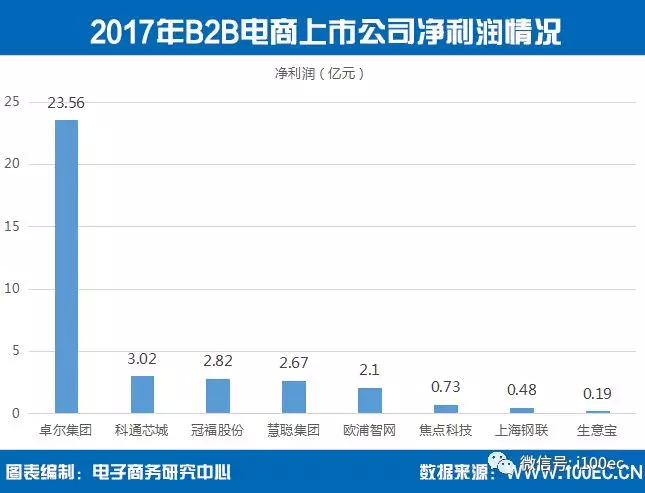 据电子商务研究中心监测数据显示,2017年中国B2B电商上市公司净利润排名上,卓尔集团23.56亿元排名第一,其次为:科通芯城3.02亿元、冠福股份2.82亿元、慧聪集团2.67亿元、欧浦智网2.1亿元、焦点科技0.73亿元、上海钢联0.48亿元、生意宝0.19亿元。