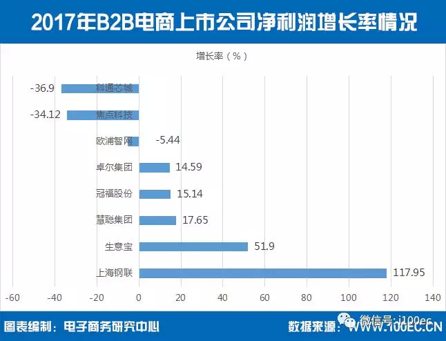 据电子商务研究中心监测数据显示,2017年中国B2B上市公司净利润增长率排名情况分别为:上海钢联117.95%、生意宝51.90%、慧聪集团17.65%、冠福股份15.14%、卓尔集团14.59%、欧浦智网-5.44%、焦点科技-34.12%、科通芯城-36.90%。