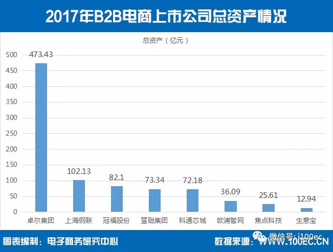 据电子商务研究中心监测数据显示,2017年中国B2B电商上市公司总资产排名上,卓尔集团473.43亿元、上海钢联102.13亿元、冠福股份82.1亿元、慧聪集团73.34亿元、科通芯城72.18亿元、欧浦智网36.09亿元、焦点科技25.61亿元、生意宝12.94亿元。