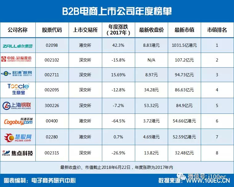 据电子商务研究中心“电子商务上市公司财务数据库”显示,已上市的8家B2B电商公司,生意宝、焦点科技、上海钢联、欧浦智网、冠福股份为A股上市深交所上市,慧聪集团、科通芯城、卓尔集团为港交所上市。