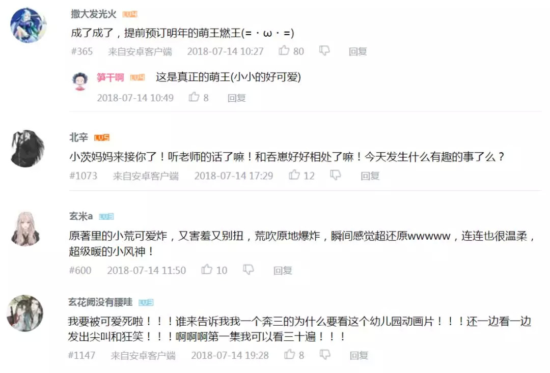 这部根据同人漫画改编的《百鬼幼儿园》将视角放到了童年,天马行空地描绘了幼年式神们轻松搞笑的幼儿园日常。两周前刚刚公布先行PV,奶声奶气的式神崽崽们立即萌倒了一片网友,第一集播出之后更是满屏弹幕告白,不少评论高喊“简直被萌出血,急需止血包和担架”。二次元的世界,“萌”果然是第一生产力。