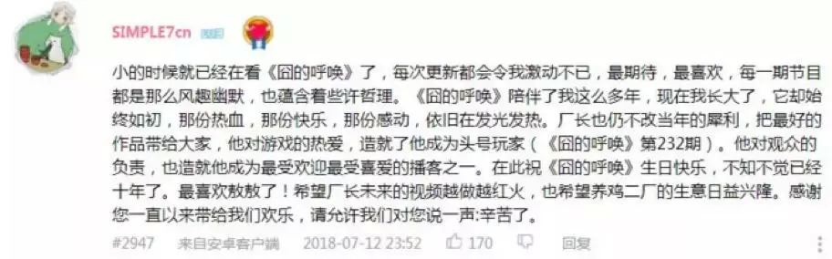 7月12日,第237期《囧的呼唤》十周年作品在B站发布。当天凌晨,7万人同时在线观看。