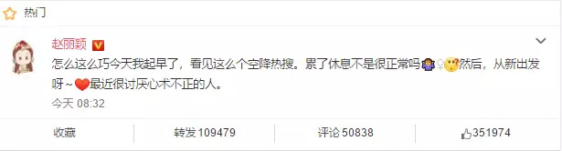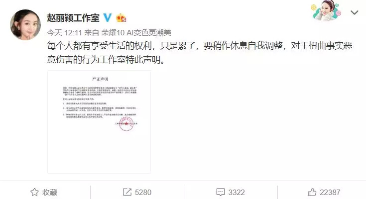 日前,赵丽颖由于身体原因宣布暂时不再接拍新戏,该话题登上了热搜榜第一。赵丽颖工作室发声明表示:“赵丽颖患心脏病、脑血栓”等为不实报道,工作室对发布者进行强烈谴责和严重警告,并保留追究发布者法律责任的权利。今日上午,赵丽颖回应暂时停工只是累了稍作休息。