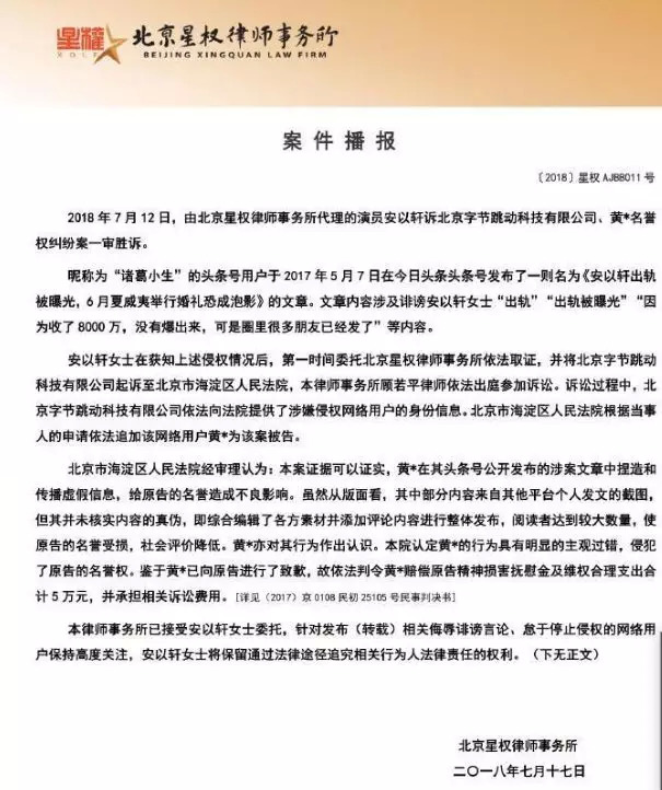 安以轩名誉维权案一审胜诉
