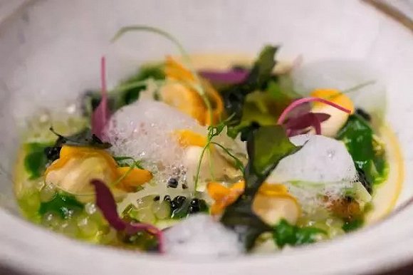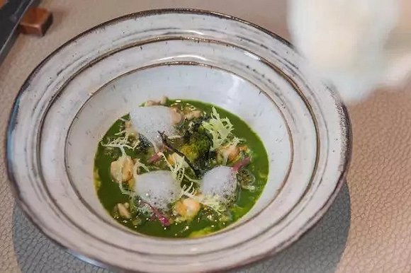 当松茸遇上西餐料理大师,又会玩出怎样的花样?这道由米其林后备餐厅主厨李俊杰所做的松茸海鲜鱼蛋,将松茸切成颗粒,与水蛋相蒸,加上蛤蜊,表面是上鱼子酱和菠菜汁。