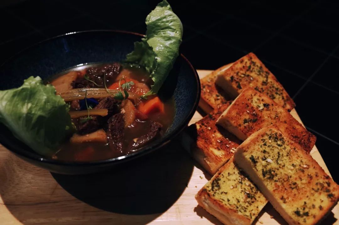 这张照片,惭愧,真是没拍出菜品原本的美味,别看照片不咋地,入口真是惊艳四座!黑啤入料慢炖八小时,牛腩变得松软入味。什么叫入口即化,算是彻底感受到了,并且无法自拔。川式的咸香充盈在唇齿间,胡萝卜的巧妙介入,留给口腔丝丝回甜。就着香脆的黄油面包一起吃,滋味上好佳呀。