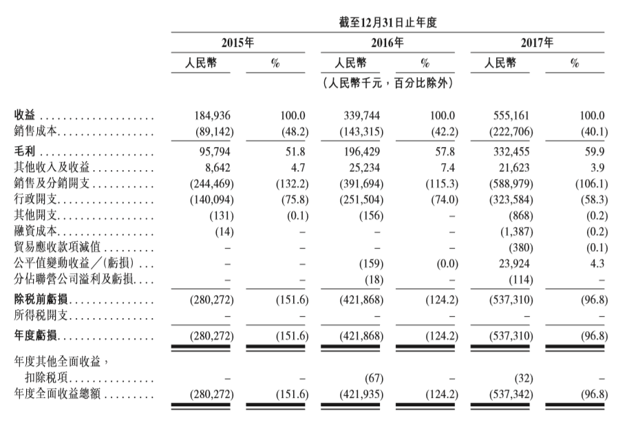 招股书显示,沪江2015-2017年的营收分别为1.84亿、3.39亿和5.55亿元,年复合增长率为73.3%,维持着相当高的增速水平。然而如同不少在线教育公司一样,沪江还没能实现盈利。过去三年,沪江的净亏损逐年扩大,分别达到了2.80亿、4.21亿和5.37亿元。
