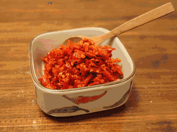 在这座小城,仅是蘸水,就可以轻轻松松列出十几种:糟辣椒、糊辣椒、糍粑辣椒、辣椒面、油辣椒、鸡辣角、烧辣椒、香辣脆、阴辣椒、柴火辣椒、豆豉辣椒、肉末辣椒……就连路边的小吃摊也能看到至少三种不同的辣椒罐罐。