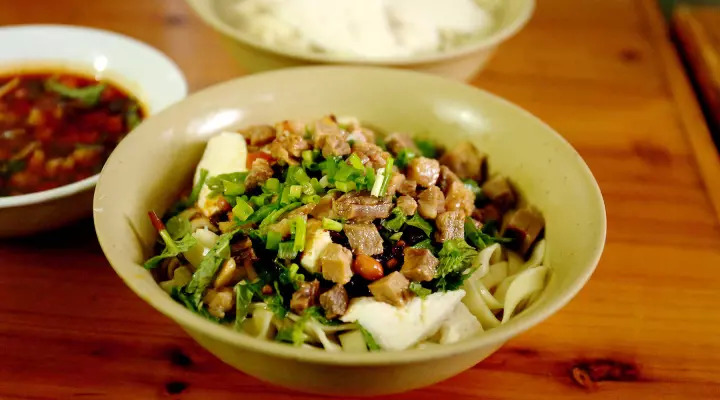 手工制作的碱面浸在豆浆里,再盖上雪白的豆花,素净的一碗看似没什么花头,其实功夫都在旁边那碗蘸水里。关于蘸水每家店都有自己的独门配方,但用的都是遵义本地的原材料,离开遵义要想做出这种味道比登天还难!