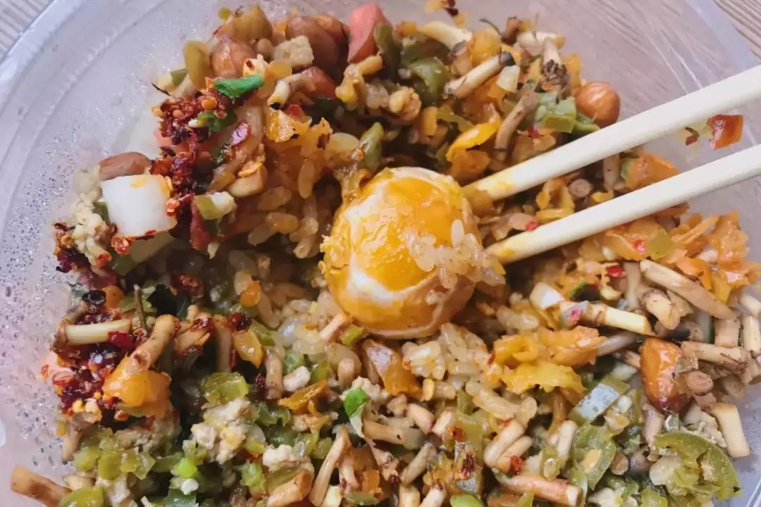舀一勺已经蒸好的糯米饭摊平,加一勺油辣子,然后再盖上各种配料,味美价廉能吃饱,性价比极高的糯米饭是伴随无数遵义人成长的味蕾记忆。