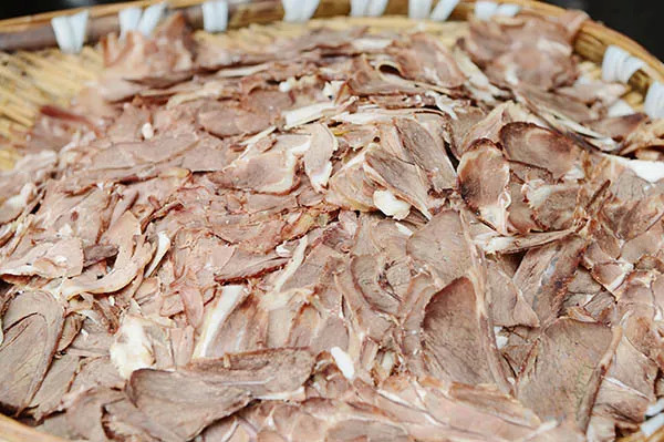 羊肉粉要想好吃,羊肉是关键。羊要选择生长期三年以上的本地矮脚山羊,这种羊是在山坡上散养,食百草长大,所以煮熟后几乎没有膻味,肉质紧实细嫩,肥瘦适中,因为还带着肉皮,吃起来微微有些弹牙。