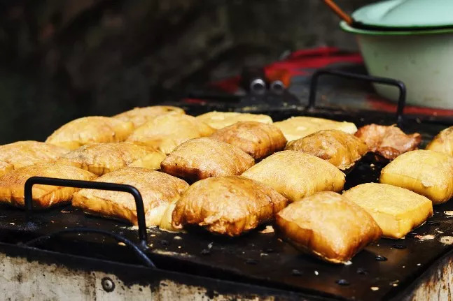 将经碱水洗泡发酵好的豆腐烤至两面皮黄、松泡鼓胀后,当腰剖开,填进拌好的佐料,一份恋爱豆腐果就完成了。捞沙巷有好几家恋爱豆腐果摊,时间充裕的可以一家家先看一遍,选择自己喜欢的豆腐烤焦程度。