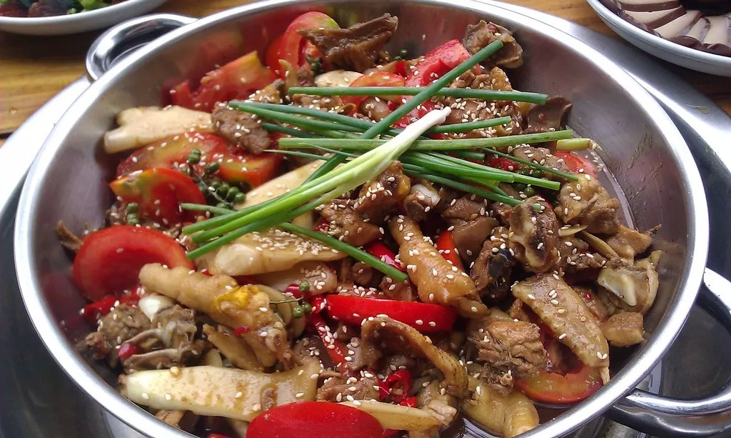荤素搭配的烙锅是遵义人用来欺骗自己的“养生锅”,最传统的烙锅用的是草帽锅,中间凸起让油自然滑落到边缘,烙好的菜就不会过于油腻。