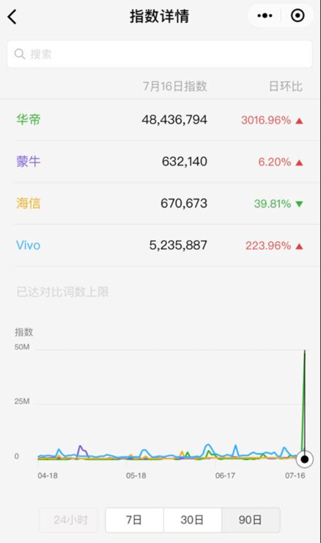 无论是在公司内部,还是与诸多公司的世界杯品牌竞争中,这场营销威力都有点超乎想象,也让华帝出尽了风头。界面新闻记者搜索发现,无论是百度指数、微信指数、微博等话题热度上,华帝都领先于其他世界杯赞助品牌十倍以上,但其投入的营销费用可能仅是其他品牌的十分之一。
