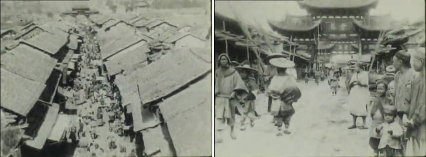 或许是出于猎奇的心理,方苏雅还拍摄了两组屠夫杀猪的镜头,在电影摇篮时期,这可算是生猛“重口”的摄像之举。第一组影像中环境优雅,黛瓦白墙,杀猪者衣着体面,应是大户人家的仆役在操刀屠宰;第二组影像中的屠夫衣服破烂,背后的土房墙壁破裂,村童环伺,或是普通村民在屠宰年猪。有趣的是,无论贫富如何,在杀猪的过程中都有人烧香燃纸,进行简单的祭祀,或为告慰猪灵,庇佑投胎之举。这一仪式今日已不可见,屠宰在当代社会越来越成为远离公众视野的死亡流水线,先人基于轮回往生的朴素信仰,为生命之牺牲燃起的火烛,也早已悄然寂灭,只余星点流落在异国他乡的影像残片中。