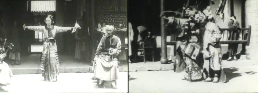 方苏雅通常在一座宅院门内的空场拍摄他感兴趣的演出活动。如果参考他对于领事官邸的一番描述:“在这个院子的左边,有一条中国式的长廊,有孔透光的建筑物,挂着薄薄的绢纸,既可当墙,又可作窗。这条长廊被一个宽敞的过厅式的玩意儿分成了两部分。”这个地点应该正位于领事馆内部,便于他不受干扰地进行电影拍摄。在高蒙百代电影公司收藏的资料当中,存有两组戏曲演出的场景,其中既有以武丑为主角满场打闹的武戏,又有儿女祝寿、金玉满堂的文戏,每一场戏均有十名左右的演员上场表演,人头攒动,场面相当热闹。在皮特·里弗斯博物馆收藏的电影版本中,同样有两场戏曲表演。首先是一位男性旦角的舞蹈,他身材颀长,舞姿舒展,在琴师的伴奏下,举手投足颇具风韵,应是未上戏装前的一套戏曲舞段。在随后的戏曲演出中,这位演员身着刀马旦戏服,与另三位男演员在镜头前表演了一出武戏,手舞足蹈,令人眼花缭乱。有趣的是,刀马旦在与一名武生演对手戏时,忽然亲吻了对方的脸颊,不知这是某部戏文的桥段,还是那位男旦演员的即兴发挥。