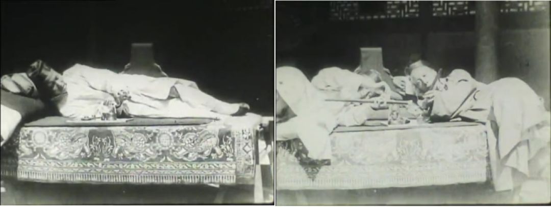 在方苏雅拍摄的影片当中,有两组镜头表现了中国男子吸食鸦片的镜头。第一组是一名头戴瓜皮帽的男子横倚在一张烟榻上,烟榻卧具绣花,十分精美,男子对着摄影机展示了填充烟土、点燃烟枪以及吸烟享受的全部过程。而在接下来的镜头中,该男子与另一位年龄、身份相仿的同伴分享烟榻,并头而卧,于烟云之下谈笑风生。
