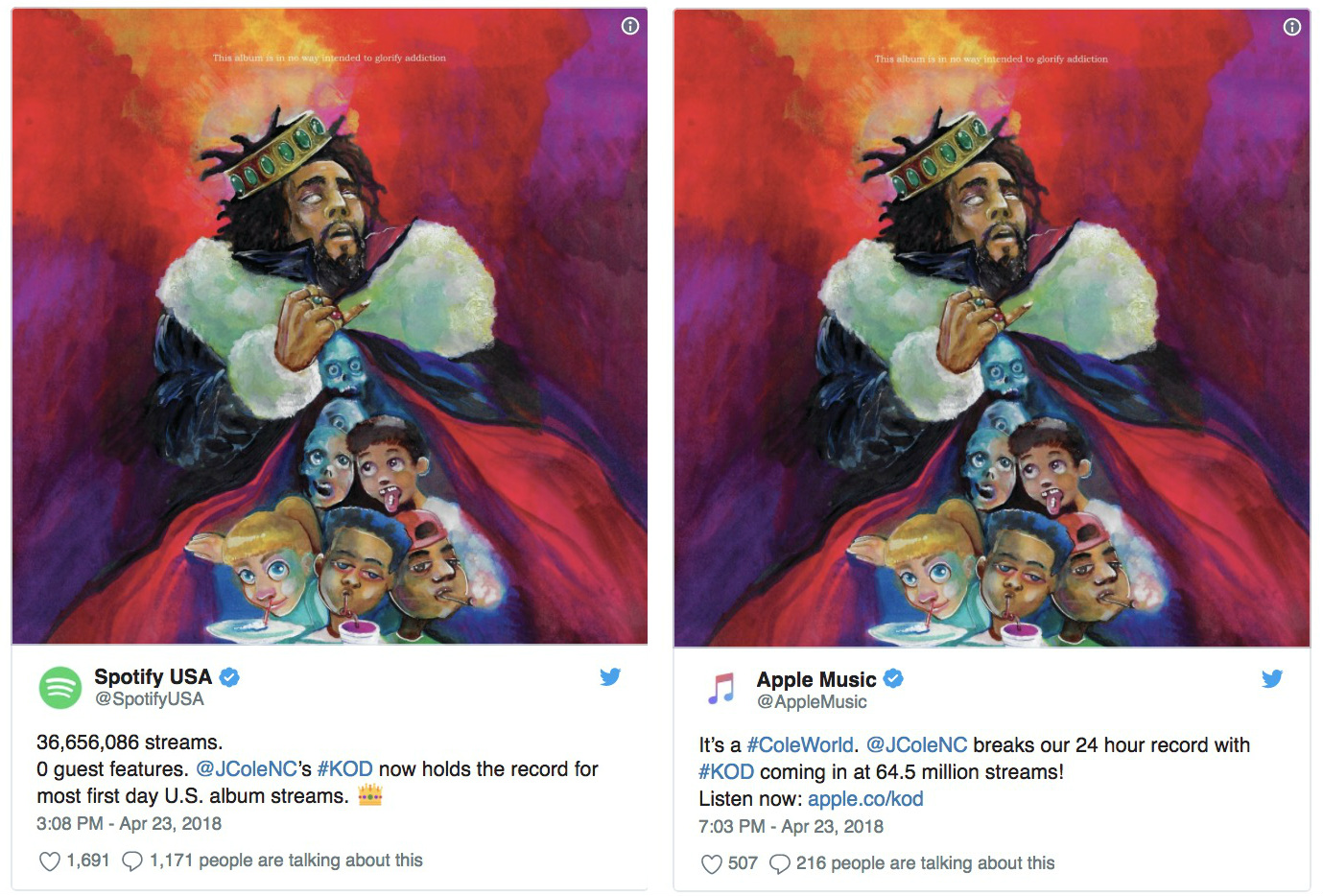 其次,6月29日《Scorpion》上架时,Spotify遇到了系统故障,在Apple Music准时上架两小时后才得以正常运转,这导致很多Spotify用户为了急于听歌跑去了Apple Music,从而严重影响了专辑播放数据。