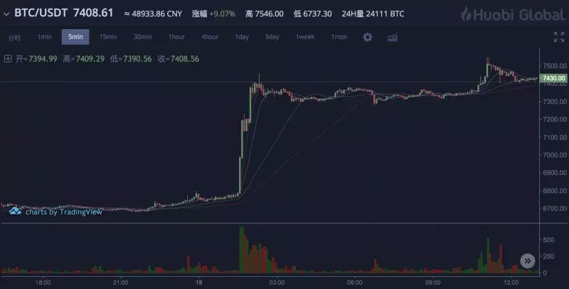 在半个小时内,比特币出现了两次大幅拉升,大涨600美元,由6780美元冲到了7380美元,涨幅达到了8.8%。