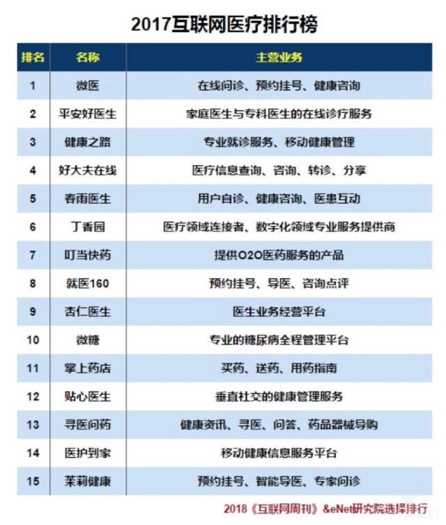 2010年2015年间 ,互联网医疗企业如雨后春笋般诞生。这些平台代表包含以提供分诊导诊、预约挂号服务为主的微医、就医160、好大夫在线等;提供健康咨询及健康管理服务的平安好医生、春雨医生等;一站式购药服务的1药网、快方送药、七乐康等,提供远程医疗租赁设备服务的远程视界等。