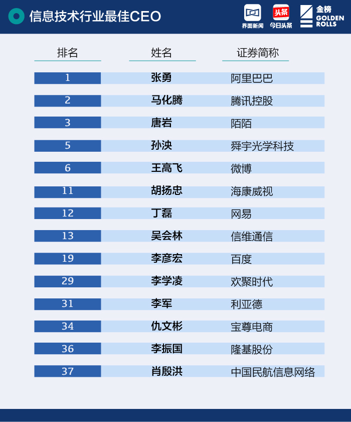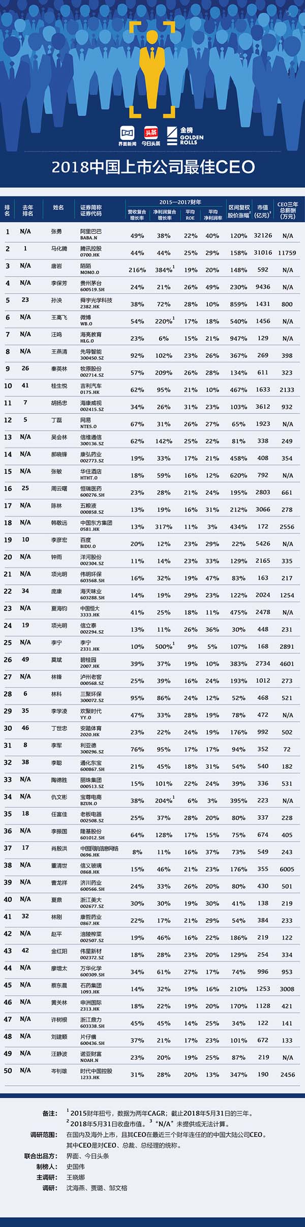 入选“2018中国上市公司最佳CEO”的50位CEO中,有20位连续两年登榜。今年新上榜的阿里巴巴首席执行官张勇(任期刚够三年,进入候选池),击败卫冕冠军马化腾荣登榜首。