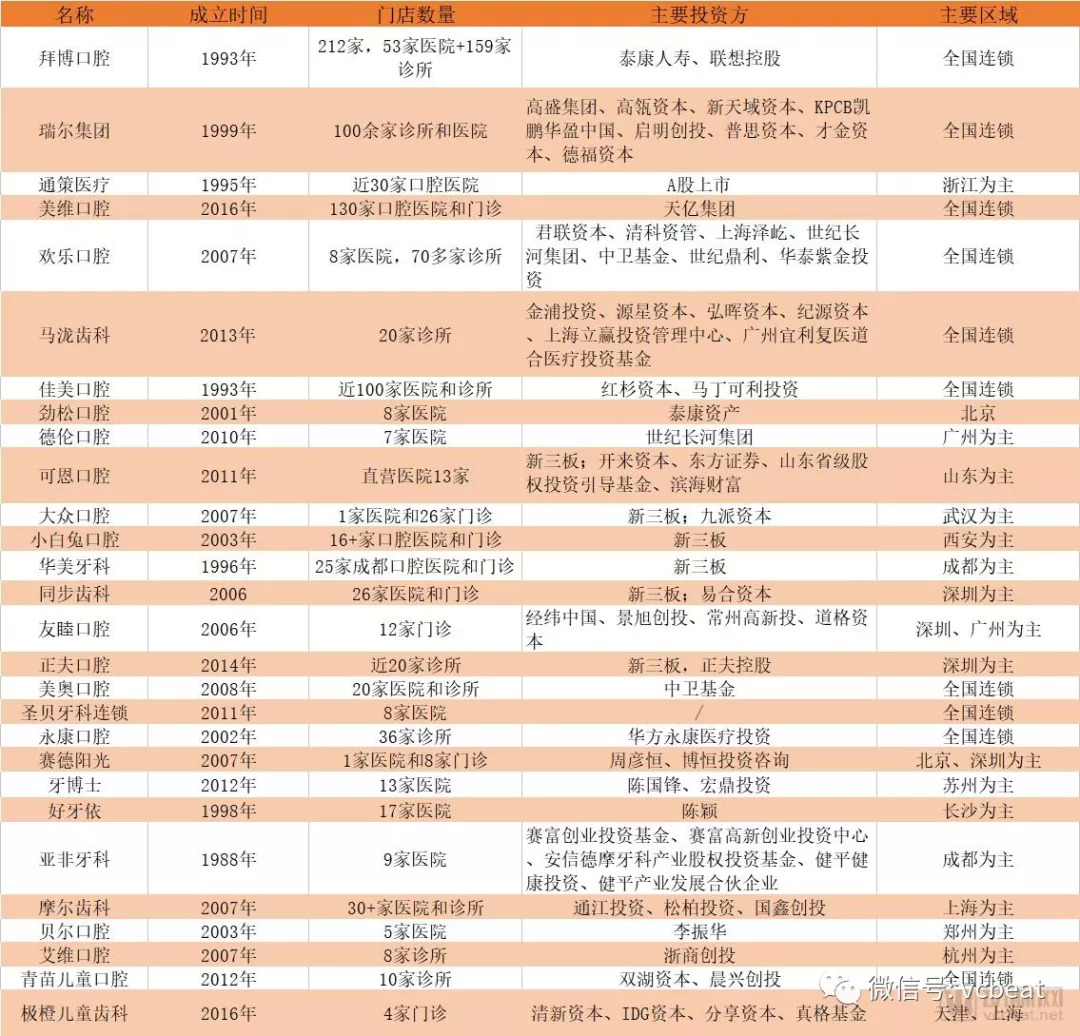 中国一些典型口腔连锁品牌,资料来源于公开资料整理,尽量保证数据完整和准确