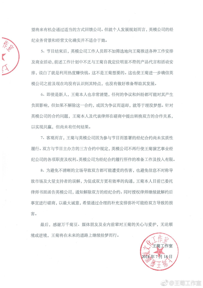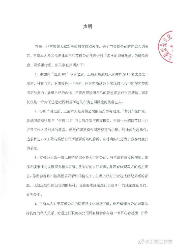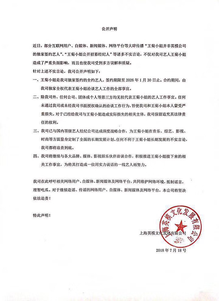 然而,一天以后,经新浪微博认证的蓝V账号“王菊工作室”就发布声明,表示王菊已委托律师向英模公司正式提出解约。