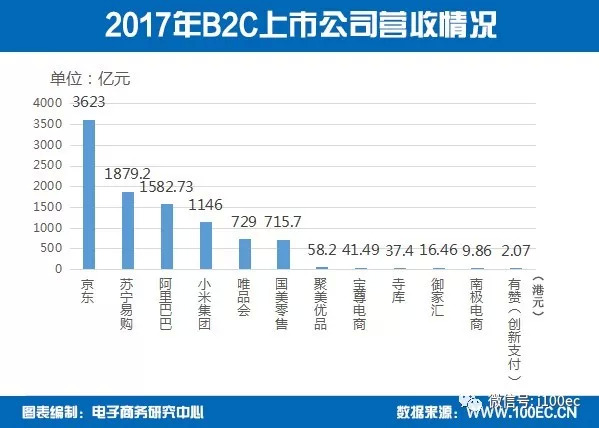 据电子商务研究中心监测数据显示,2017年B2C电商上市公司营业收入排名分别为:京东3623亿元、苏宁易购1879.2亿元、阿里巴巴1582.73亿元、小米集团1146亿元、唯品会729亿元、国美零售715.7亿元、聚美优品58.2亿元、宝尊电商41.49亿元、寺库37.4亿元、御家汇16.46亿元、南极电商9.86亿元、有赞2.07亿港元。